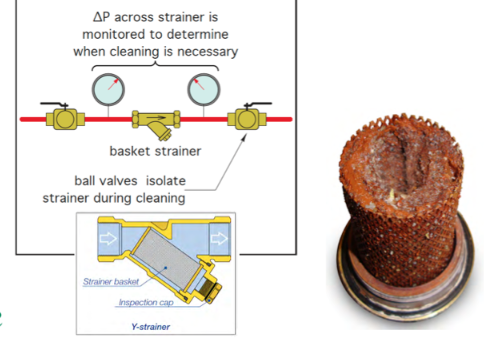 Strainer berfungsi untuk memfilter kontaminan sebelum fluida memasuki unit ukur. Jika elemen penyaring rusak atau jebol, partikel padat akan masuk ke dalam chamber dan mengunci pergerakan rotor.